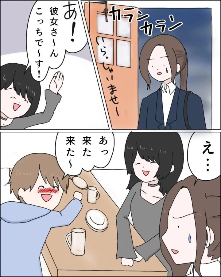 その後、私は急いでレイが指定した店へ向かいました。すると、「あ!彼女さ~ん、こっちで~す」と見知らぬ女性に声をかけられます。呼ばれるままに近づくと、そこにはレイの姿が。私に気づいたレイは、「あっ来た来た~」と上機嫌で言いました。