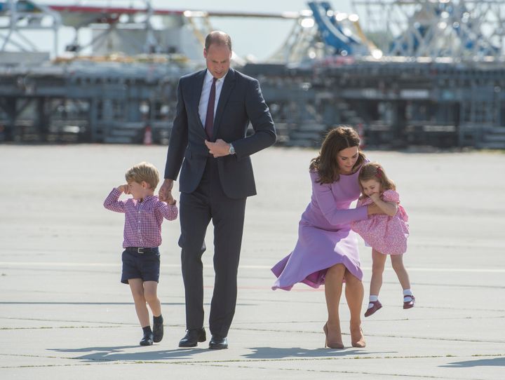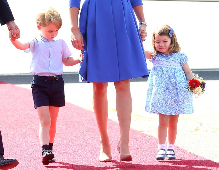 ポーランドとドイツへの公式訪問中、ベルリン・テーゲル空港でキャッチされたファミリーの姿。シャーロット王女は歓迎の人々から花束をプレゼントされた。