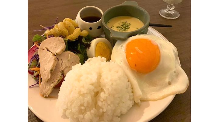 本日の七ツ蔵ごはん とり肉山芋入ふわふわハンバーグプレート 1200円(目玉焼きの下にハンバーグが隠れています)