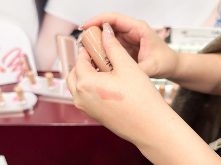 fweeからは、ローズの花びらのような血色カラーで、パーソナルカラーに関係なく使える「ローズオブセッションステイフィットティントティント」を発見。担当者曰く、本コレクションはグローバル限定で発売されていて、発売2日で完売してしまうほど人気だったのだそう。