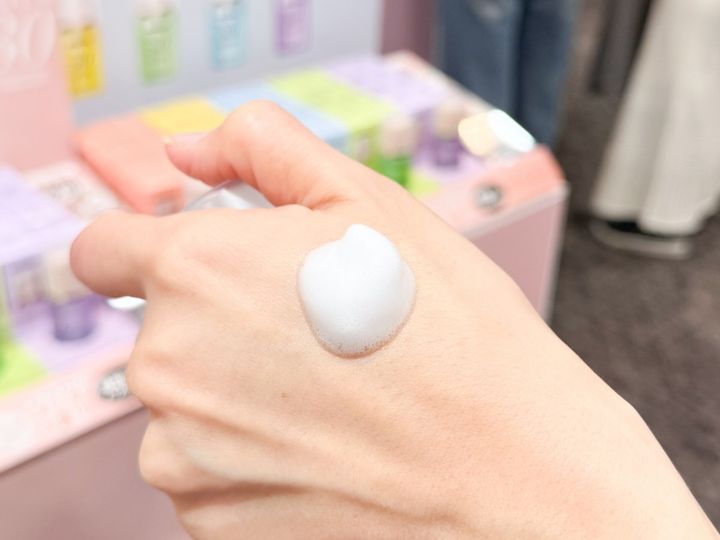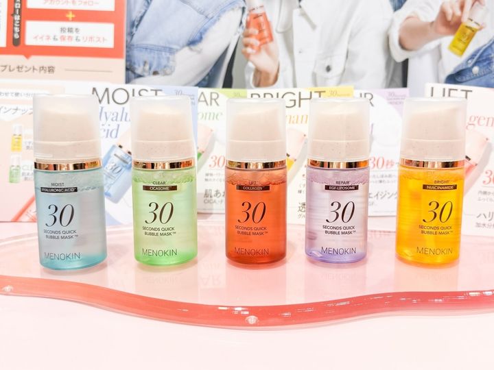 スキンケアブランドのブースを覗いてみると、目新しいアイテムをいくつか発見。日本に上陸したばかりのスキンケアブランドのMENOKINからは、肌になじませるだけでシートマスク後のようなうるおい感のある水光肌へと導く、バブルタイプのマスク「MENOKIN 30秒クイックバブルマスク」が販売中です。