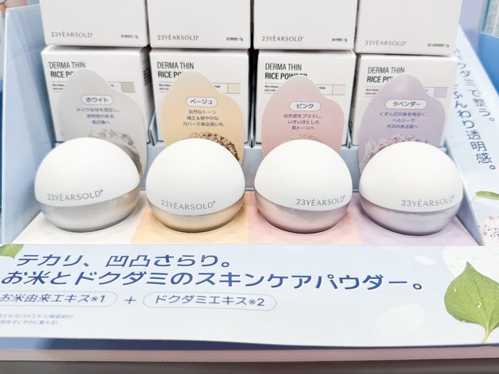 23 years oldのブースで気になったのは、オブジェのようなころんとしたフェイスパウダーです。「ダーマシンライスパウダー」は、余分な皮脂を抑えて肌をサラサラにするルースパウダーで、超微細パウダーが毛穴や凹凸を自然にカバーし、くすみ(※1)を飛ばしてふんわり明るい肌印象へ導きます。