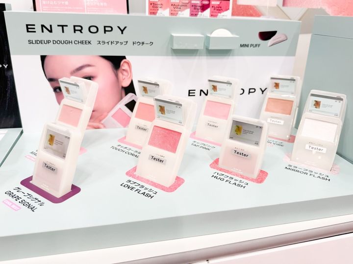 ENTROPYの「スライドアップ ドウチーク」は、ガジェットのようなパッケージデザインでスライド式という珍しいチーク。むちっとやわらかなテクスチャーで、付属のミニパフにとってなじませると、肌へ密着しながらジュワッと発色します。