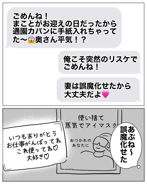 じつは交際しているまことと、彼の娘の保育園の先生・ちか。まことの妻のまいは何も知らず、家事育児はしないけれど保育園の送迎だけは積極的なまことに感謝していました。ちかはまいに嫌味を言って憂さ晴らしをしていたので、叱られないように通園バッグをチェックしたまい。すると中から出てきたのは手紙とホットアイマスクでした。どう見ても園児同士でやり取りした手紙ではありません。夫に見せると、ママ友同士の手紙を間違えて入れてしまったのではないかと言います。