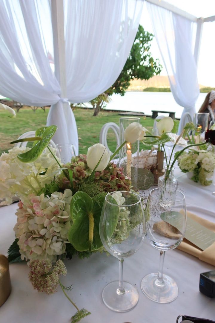 一方、ハワイの海風が感じられるガーデンパーティではヴァージンロードから食卓に至るまで、ナチュラルな印象を与えるグリーンを基調とした花々で彩りを加えました。花の種類やカラートーンまで、多種多様なゲストの方々の顔を思い浮かべ、心を込めてセレクトしました。