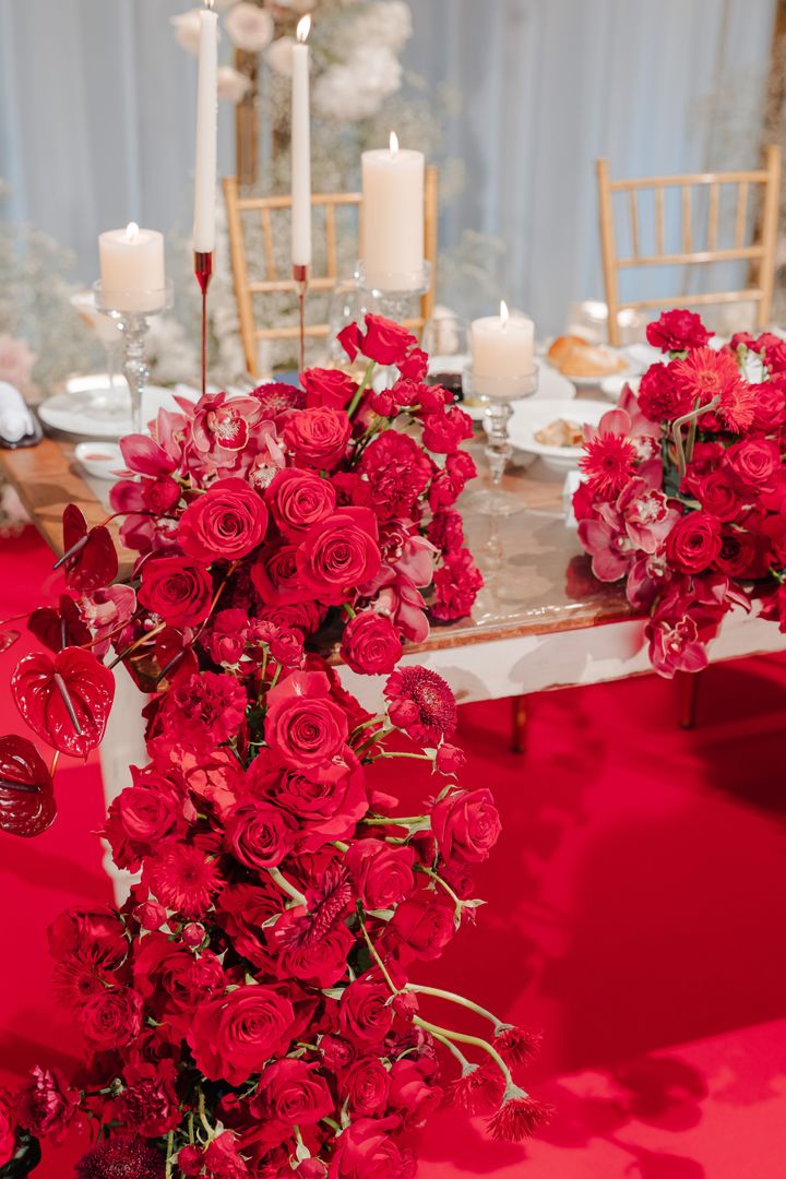 昨年行われた結婚式や披露宴の装花もそんなドイツでの生活がインスピレーション源になっていた、と気付かされます。東京の披露宴会場では、白&ベビーピンクの花々で染まったクラシカルな装飾から、お色直しのドレスに合わせた真紅の花々で埋め尽くす華やかな空間へと一新する、ドラマティックな演出に。