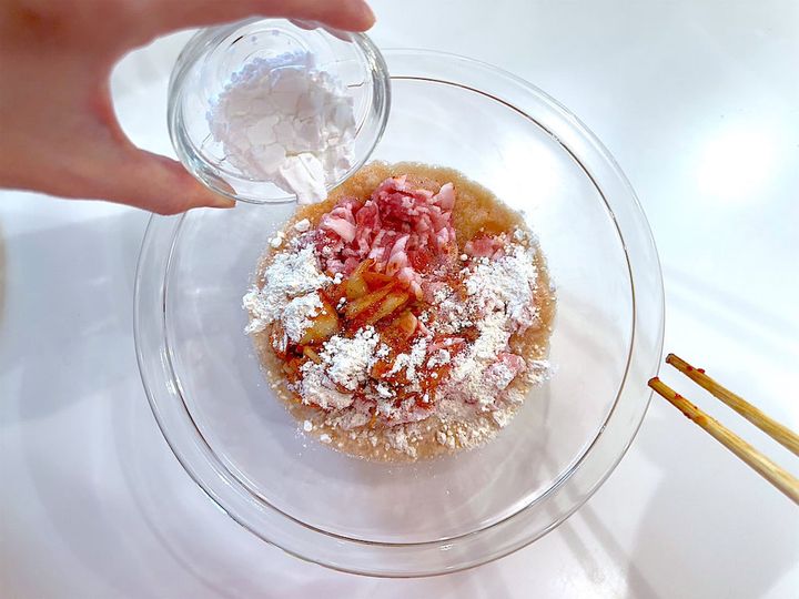 3. ボウルに1のじゃがいもと2の豚肉、キムチ、小麦粉、片栗粉、塩・こしょうを入れて混ぜ、4等分にする。