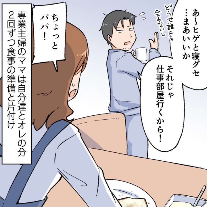 オレはトーストを少しだけかじって急いで立ち上がり、「あ~ヒゲと寝グセ・・まぁいいか。どうせ誰にも会わないし。それじゃ仕事部屋行くから!」と妻に声をかけてコーヒーを持って仕事部屋に向かいました。後ろから「ちょっとパパ!」と少し怒っているような妻の声がしましたが、始業時間に遅れそうなオレは聞こえないフリをして仕事部屋に急ぎました。オレが起きるのが遅くなったせいで、専業主婦のママは自分たちとオレの分の2回ずつ食事の準備と片付けをすることになっていることに、この時のオレはまだ気づいていませんでした。