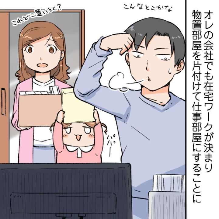 オレの会社でも在宅ワークが可能になり、物置部屋を片付けて仕事部屋にすることにしました。妻のゆきのと娘のさくらも手伝ってくれ、なんとか仕事ができる状態になりました。
