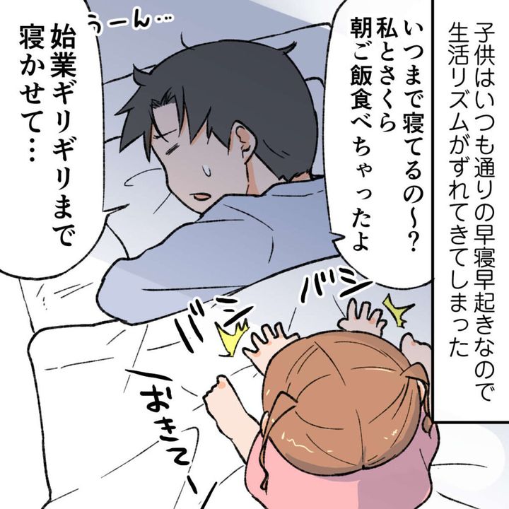 子どもはいつも通りの早寝早起き。寝る時間が遅くなったオレは朝起きられず、妻と子どもと生活リズムがずれてきてしまいました。朝、「いつまで寝てるの~?私とさくら、朝ご飯食べちゃったよ」と妻の声が聞こえますが、眠くて目も開けられないオレは「うーん・・始業ギリギリまで寝かせて・・」と答えるのが精いっぱい。子どもが「起きてー」と起こしに来ても、始業まで少しでも寝ておきたいオレは聞こえないフリを貫きます。