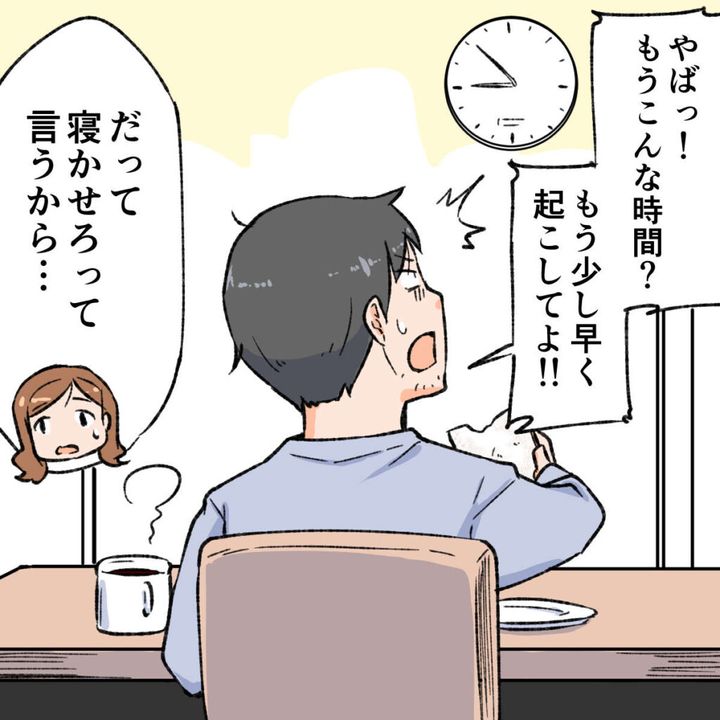 しばらくして、まだ寝ていたい気持ちに抗ってなんとか起き上がりダイニングの席についたオレは、時計を見て驚きました。まだ朝ごはんも食べていないのに、始業までもう10分くらいしかありません。「やばっ!もうこんな時間?もう少し早く起こしてよ!!」と慌てるオレに、妻は「だって寝かせろって言うから・・」とぼそり。いやいや・・そうは言ってもオレの始業時間は知ってるんだから、準備の時間とかを考えてもう少し臨機応変に対応してくれてもいいですよね。