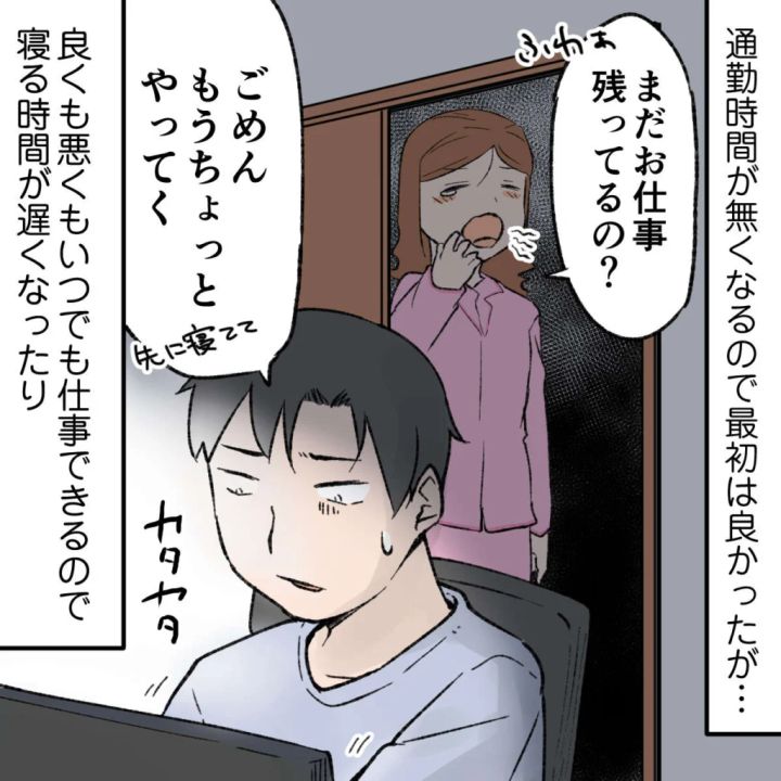 メリットもデメリットもある在宅ワーク。うまく活用できればとても便利な制度ですが、家で仕事をするとなるとどうしても家族の協力が必要になってきますよね。生活リズムがズレてしまった主人公が不自由なく今まで通りの生活ができるのは裏で妻が調整してくれているからなのですが、どうやら本人は自分のことしか見えていないようですね。