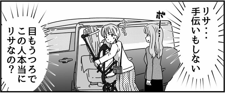 リサはうつむいたまま、何かブツブツ言っています。私はその様子を見てなんだか怖くなってきてしまいました。そして、ベビーカーを畳んで自分の車に積み込みました。リサはただ突っ立ってその様子をぼんやりと見ているだけ。手伝おうともしません。