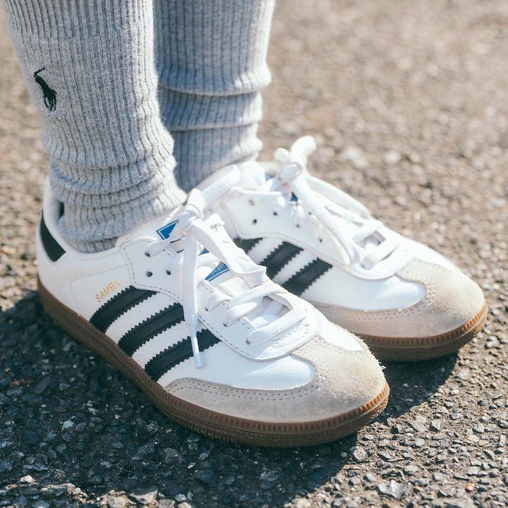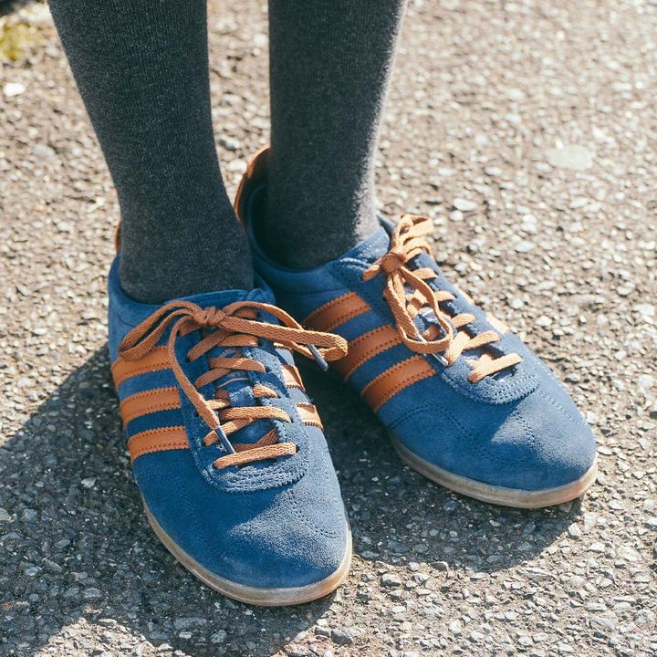 『アディダス』のスニーカーはレトロムード漂うデザインがおしゃれ! ベージュ×ネイビーのカラーリングが新鮮な一足。