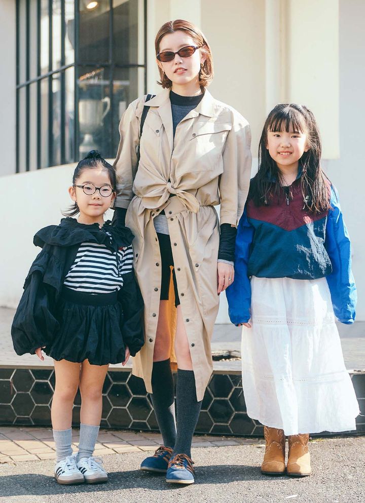 春に羽織りたくなるトレンチコートをコンサバになりすぎないよう、小物で肩を抜いたママコーデがお見事! お揃いすぎるものがなくとも、みんなで甘辛く仕上げて、統一感のある家族コーデに昇華したのはポイント。