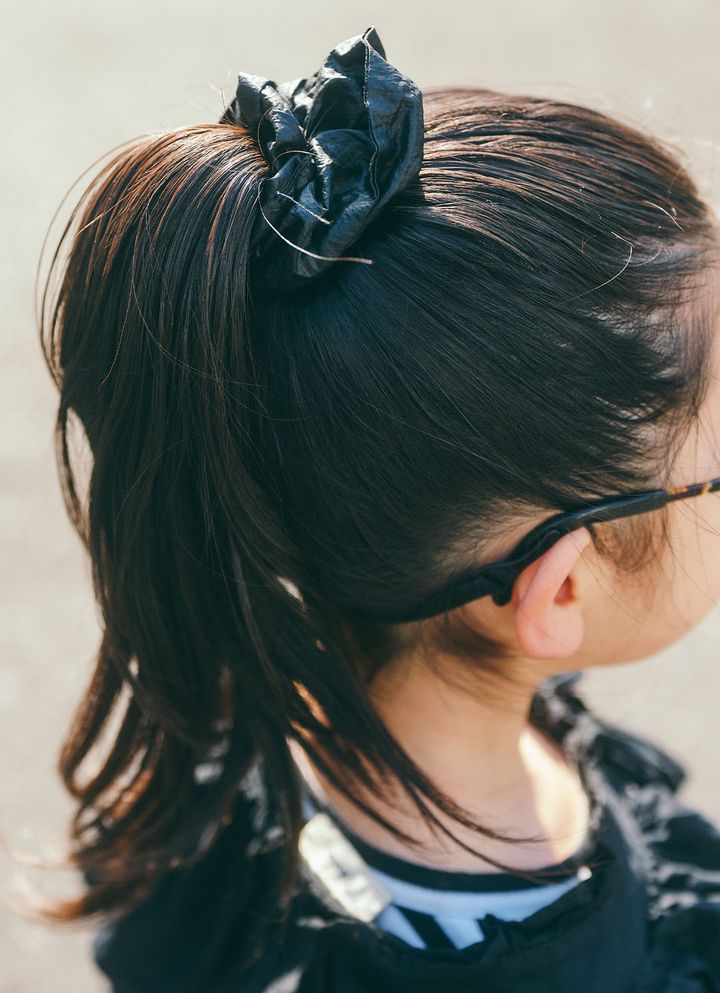 ブラックのシュシュでまとめたポニーテールが可愛い! フリルたっぷりのトップスとテンションを合わせたのがグッド♪