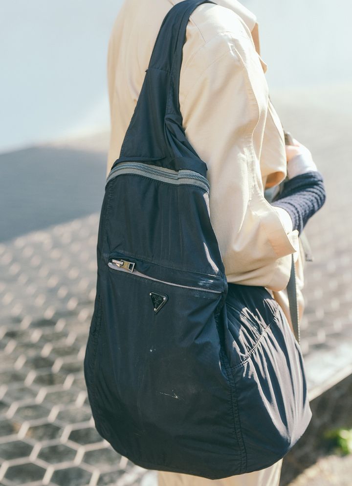 ママが肩にかけたナイロンバッグは『プラダ』のもの。きれいめなアウタースタイルを、程よくカジュアルダウン。