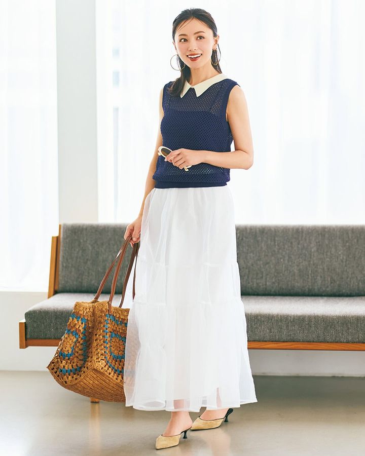 衿付きトップス¥13,000(トラッツォドンナ)スカート¥20,900(アルページュストーリー/アルページュストーリー プレスルーム)バッグ¥37,400(ヴィアメイルバッグ/ティースクエア プレスルーム)ミュール¥16,500(ルタロン グリーズ/ル タロン グリーズ ルミネ新宿店)ピアス¥14,300(ワンエーアールバイウノアエレ/ウノアエレ ジャパン)サングラス¥23,800(カリン/ H3Oファッションビュロー)