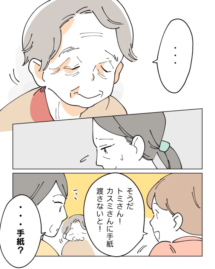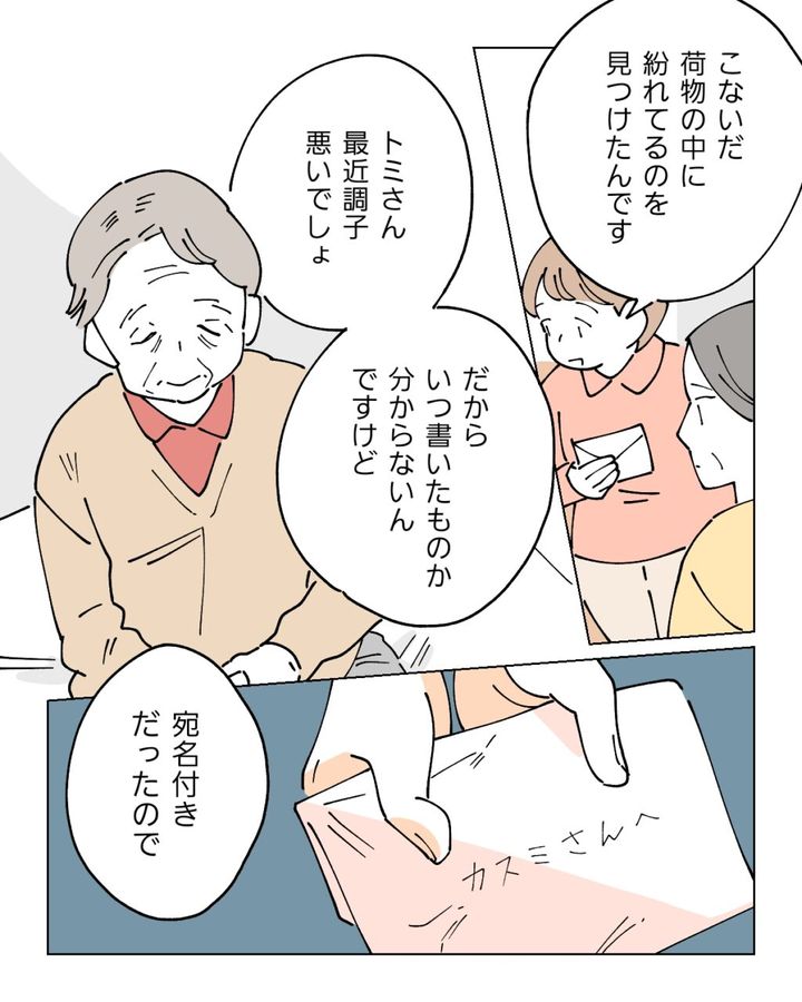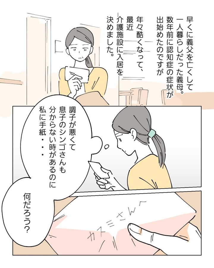 認知症が悪化しグループホームに入居している義母が自分宛てに書いた手紙を受けとったカスミさんのお話です。