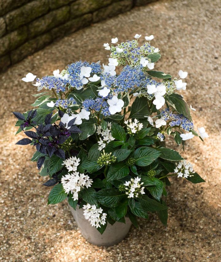 ガクアジサイは咲き始めが最も美しい。徐々に花形がくずれ始めたら早めの剪定が必要だが、斑入り葉なら花後も観賞価値が高い。7月以降は枝葉を伸ばしたペンタスが次々に花をつけて秋まで美しい寄せ植えに。