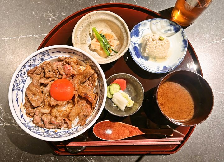 というわけで、この日はもちろん「牛丼御膳」をオーダー。神戸牛、山形牛、常陸牛の3種類があるなか、「きめが細かくまろやか」と店長さんにすすめていただいた山形牛を味わうことに。ほどなく運ばれてきた丼のふたを開くと、食欲をそそる香りがふわり。そして、橙色に輝く卵がドン!と乗った姿にもうっとり。まずは牛だけを味わい、ご飯と一緒に、そして卵黄と絡めて…と、お箸が止まりません。お店で牛丼を食べるのが久しぶりだったので(家ではよく作ります!)、正直、ちょっとヘビーかな~と思っていましたが杞憂でした。季節の小鉢まで美味しくペロリ完食です。