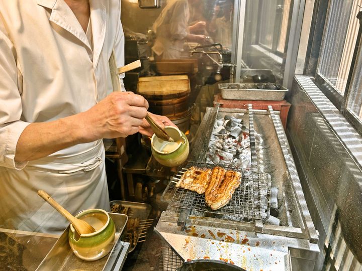 1階の客席からは焼き場も見えます。うなぎの状態を見ながらこまめにひっくり返すことで、皮と身の間の脂ががジュワリと出てきて美味しく焼けるそう。ちなみに、うな重のうなぎは地焼きの後に蒸し、タレ焼きにする関東風(江戸前)で提供。 Hearst Owned