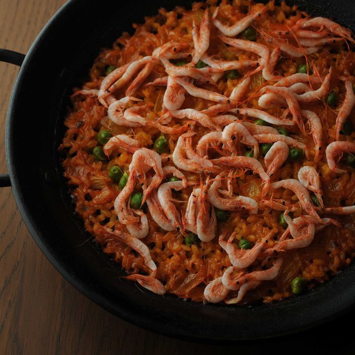 食材に合わせてだしを使い分ける自慢のパエリア。春ならではのサクラエビの香ばしさをまとったお米は、見事なアルデンテ。 Hearst Owned