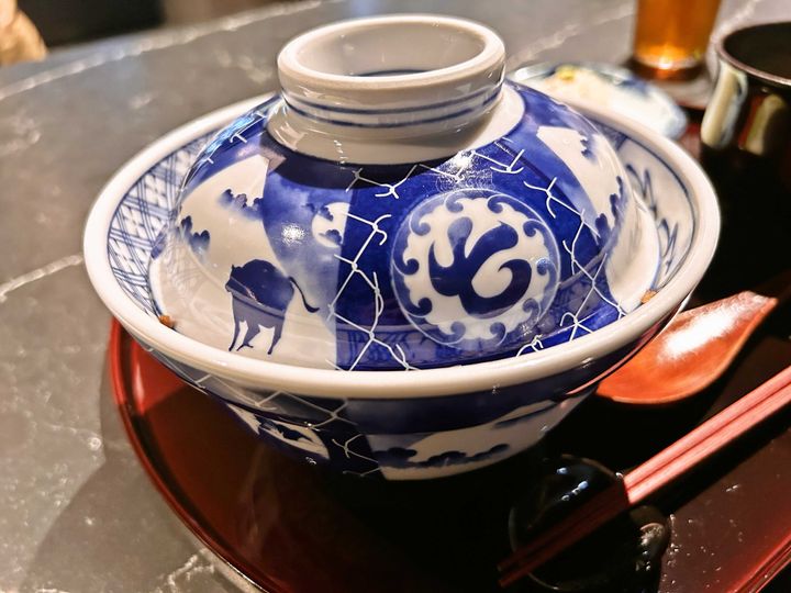 オリジナルの丼にも注目を! 店名の「七」の文字の隣には、“食べられたくなくて逃げる牛”の姿が(笑)。食材に空間、そして器まで、ファストフード的な「牛丼」のイメージを裏切る上質かつおしゃれなムードでいっぱい。 Hearst Owned