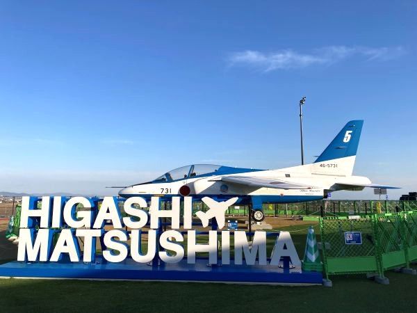 ブルーインパルスの退役機の常設展示です。今までも「HIGASHIMATSUSHIMA」のサインはフォトスポットとして人気でしたが、ブルーインパルスを間近で見ることができるということで、さらに人気スポットになっています。