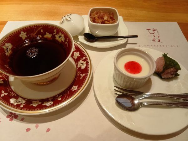 食後のお楽しみは、「パンナコッタ&桜餅」のデザート。なんと2種類も! そして、コーヒーとのセット。 和食のあとに和と洋のデザート&コーヒーまで付くなんてとっても嬉しいですよね♪ 爽やかな甘さのデザートと、深みのあるコーヒーは、ラストに相応しい一品です。