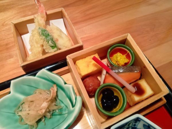 焼鮭や黒豆、菊の花のお浸しなど6種類の食彩がみっちり♪ 海老やシシトウなどの天ぷらもサクサクで美味。