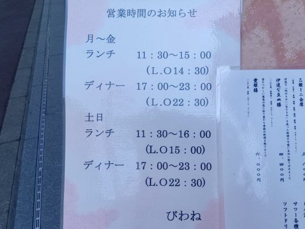 自然・食彩・浪漫 びわね 宮城県仙台市青葉区一番町3-8-8 ステア1F 電話 022-721-1567 営業時間 ランチ 月~金、祝日、祝前日 11:30~15:00 土・日 11:30~16:00 定休日 5月6日(水・振休)・7日(木)はお休み