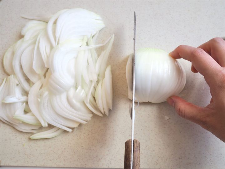 1. 玉ねぎを半分に切り、繊維に沿って薄切りにする。