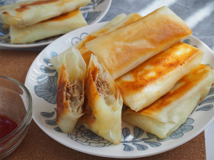 巻くときは、玉ねぎをなるべく中央に寄せて整えておくと良さそうです。形がまとまりやすく、焼いたときの表面もきれいに仕上がります。さらに巻いたあと、見せたい面を下にして少し置いておくのもポイント!重さで形が落ち着いて、焼き面が少し平らになります。焼くときは軽く押さえるようにすると、フライパンに皮が密着してパリッと仕上がりました。