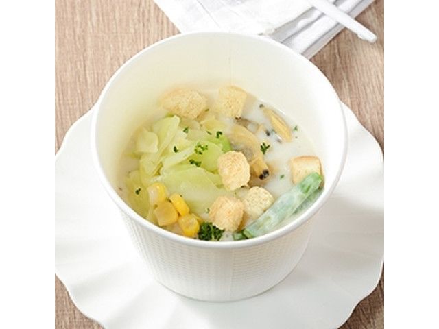 あさり・キャベツ・アスパラ・コーンを盛り付けたクラムチャウダーです。
