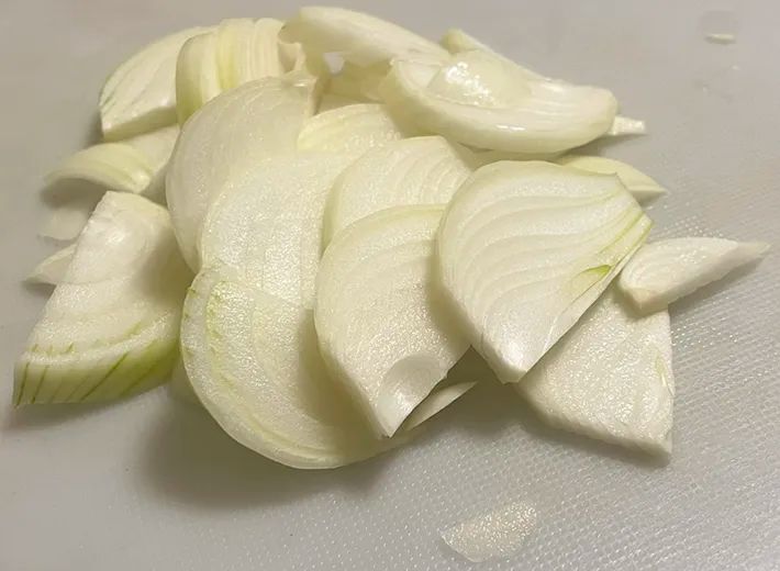 タマネギは皮を剥いて薄切りにしておきましょう。