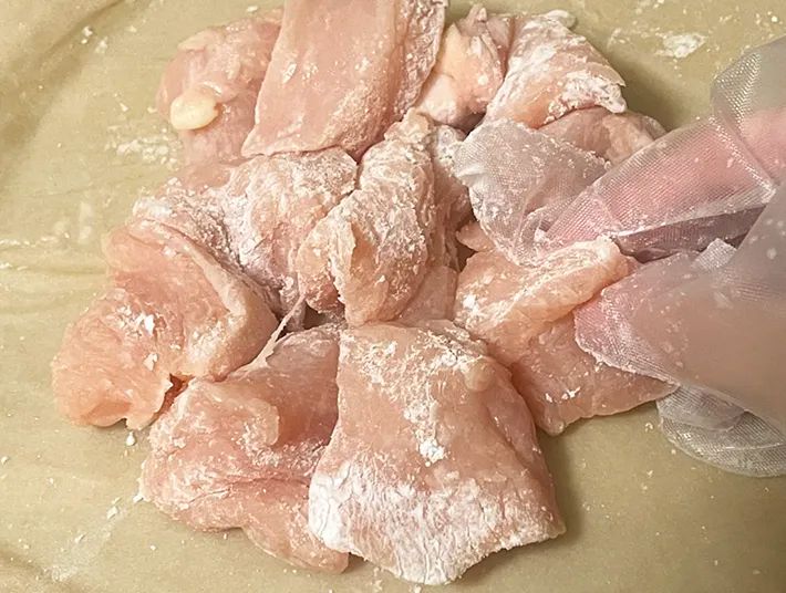 鶏肉は一口大にカットして、片栗粉を全体に絡めてください。