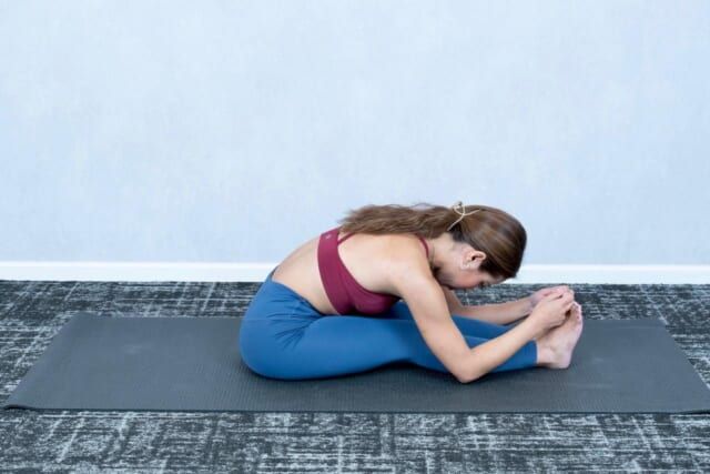 脚をそろえて長座の姿勢に。かかとを前に押し出し、つま先は天井へ向けます。骨盤を立てて背骨を上へ長く伸ばし、まずは“丸まらない状態”をキープ。手は無理に足先をつかまず、ひざやすねに軽く添えるだけでOKです。