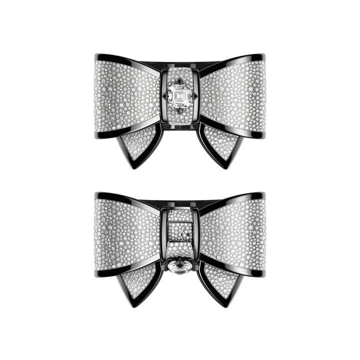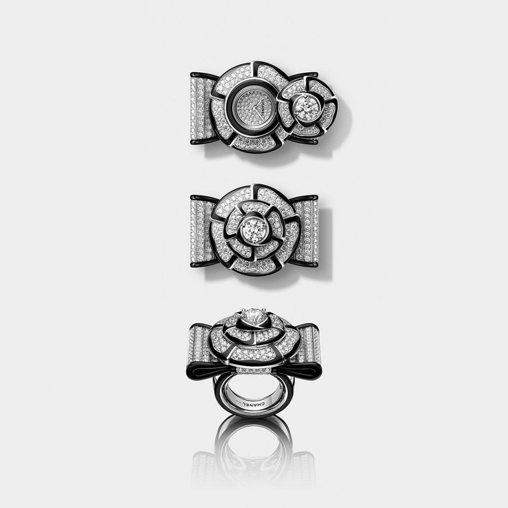 「ヌー カフ カメリア ダイヤモンド モチーフ」と「ヌー リング カメリア ダイヤモンド モチーフ」は、クチュールの優雅さとウォッチメメイキングの彫刻的な曲線美を有したカフとリング。ダイヤモンドを並べたリボンの精密なラインを、ブラックの縁取りで描き出した。