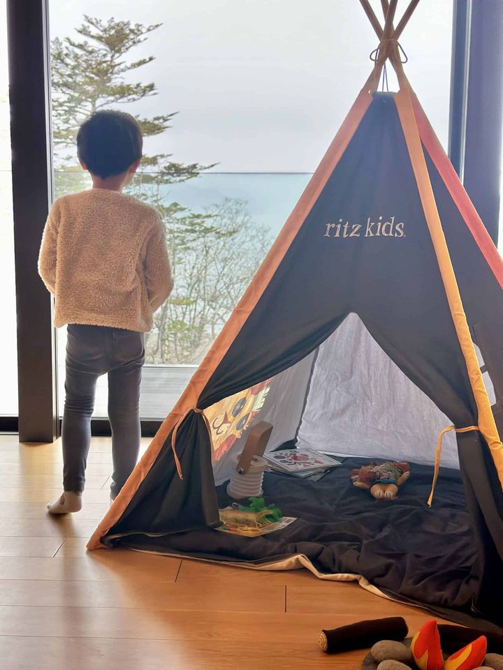 そして今回、お部屋に用意していただいた「サファリテント」。これがまた息子のツボにハマったようで、見た瞬間から歓喜、一度入るとまったく出てこない(笑)