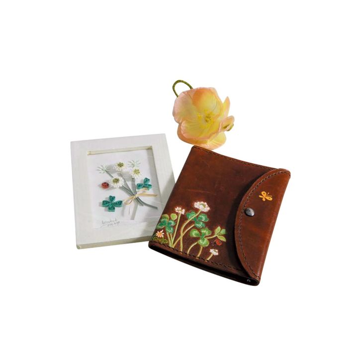 生涯学習講座のペーパークイリングや革細工の作品。「講座情報は広報誌や図書館の掲示板などでチェック」