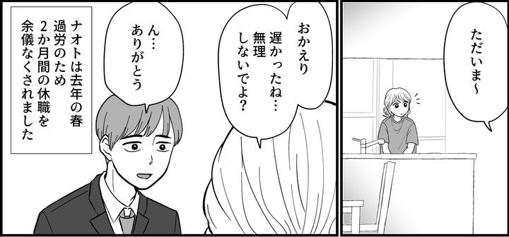 娘を寝かしつけ、私はキッチンで片付けをしていました。そこへナオトが疲れきった姿で帰宅しました。実は、ナオトは去年の春、過労のため2か月間の休職を余儀なくされました。ナオトの体調が不安定になるたび、私の心にはある気持ちが。