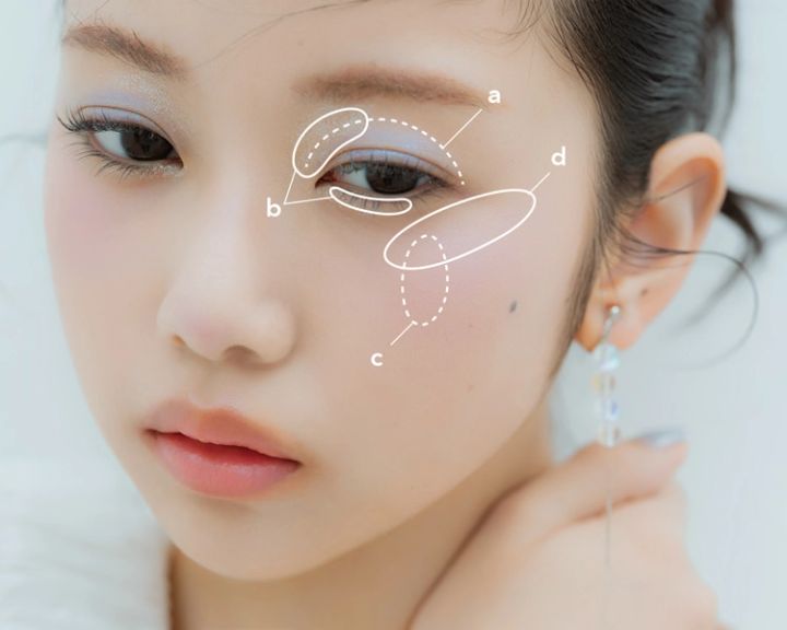 目を開いた状態で色が見える幅を確認しながら、アイホールにaを塗る。下まぶたの目頭から2/3の範囲まで、bでラインを引いて、うるんだ瞳をアピール。