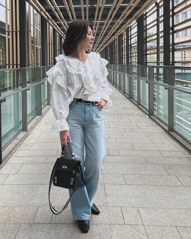 まずご紹介するのは、ガーリー服とデニムパンツを組み合わせた王道の大人可愛いカジュアルコーデ。単品で見ると子どもっぽくなりがちなフリルブラウスは、デニムパンツでカジュアルダウンすることで50代に似合うバランスに。さらにきれいめなバッグや靴を合わせて、上品さもプラスするのがおすすめです。