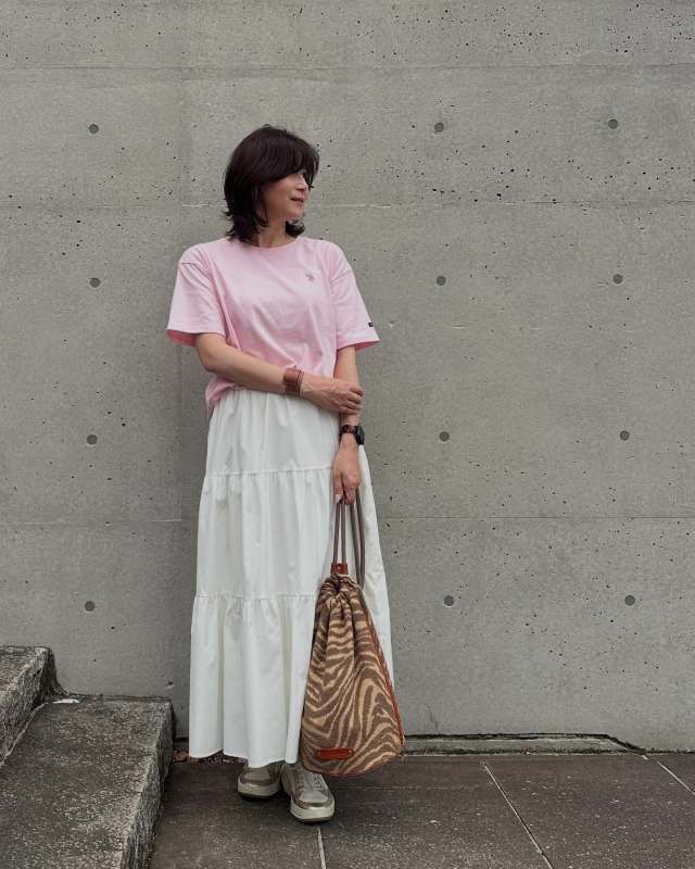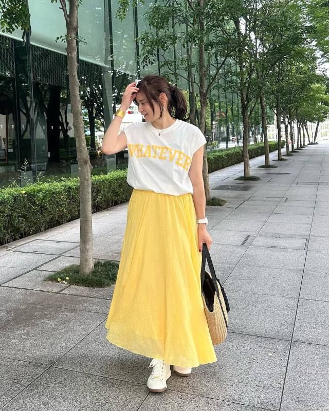 最後にご紹介するのは、Tシャツ×スカートのカジュアルコーデに可愛げカラーを取り入れたスタイリングたち。淡く明るい可愛げカラーは、何気ない着こなしもグッと華やかにブラッシュアップしてくれます。トップスで投入して顔映えを明るくしてもよし、ボトムスで取り入れればコーデしやすくまとまり感までアップします。