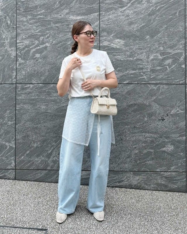 こちらでは、白TシャツとデニムパンツのシンプルコーデにチュールレースのラップスカートをON。トレンド感のある可愛げアイテムを一点投入すると、いつものカジュアルスタイルをグッとおしゃれにアップデートできますよ。