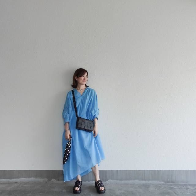 キレイ色のワンピースも50代の上品カジュアルにおすすめの一品。スナップでは、爽やかなブルーのワンピースを黒小物で引き締めています。ラフになりがちなカフタン風ワンピースは、きれいめな華奢ネックレスなどアクセサリーで品をプラスしても可愛いですよ。