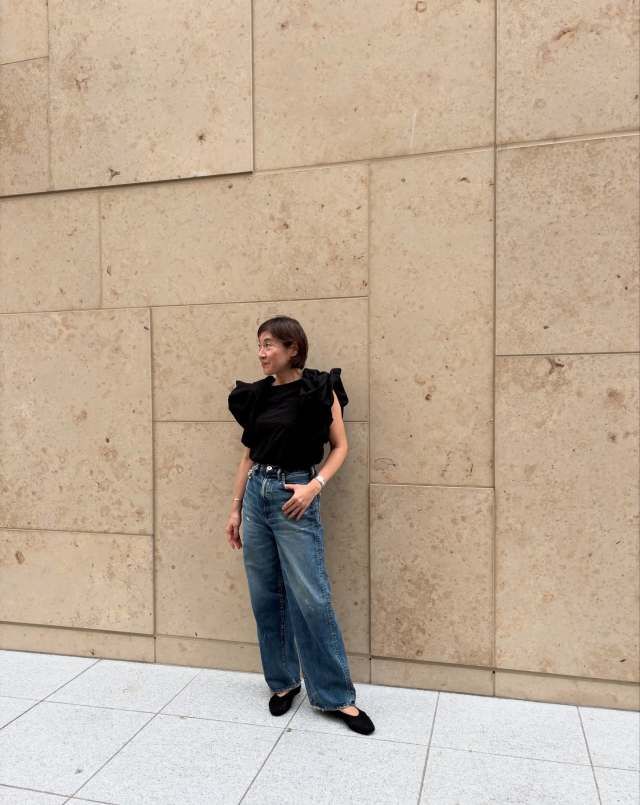 こんなボリューミーなフリルブラウスを合わせれば、デニムパンツスタイルがラグジュアリーにシフト。足元はフラットシューズでこなれ感を演出するのが今の気分にぴったりです。まさに50代に似合う大人の上品カジュアルコーデが完成!
