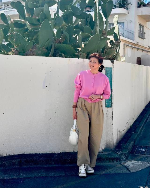 スナップは、鮮やかなピンクのカーディガンを差し色にした上品カジュアル。カーディガンは着崩さず、トップス風に取り入れると大人感がアップします。