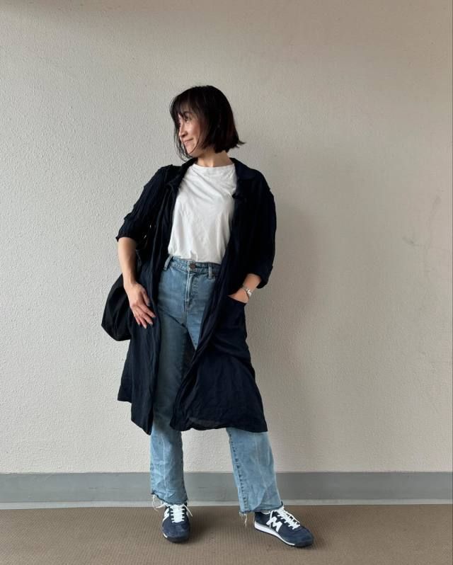 デニムパンツスタイルの場合でも、ロング丈の羽織りものが上品さをプラスしてくれますよ。こちらは、ネイビーのロングシャツをさらっと羽織って上品な印象に。